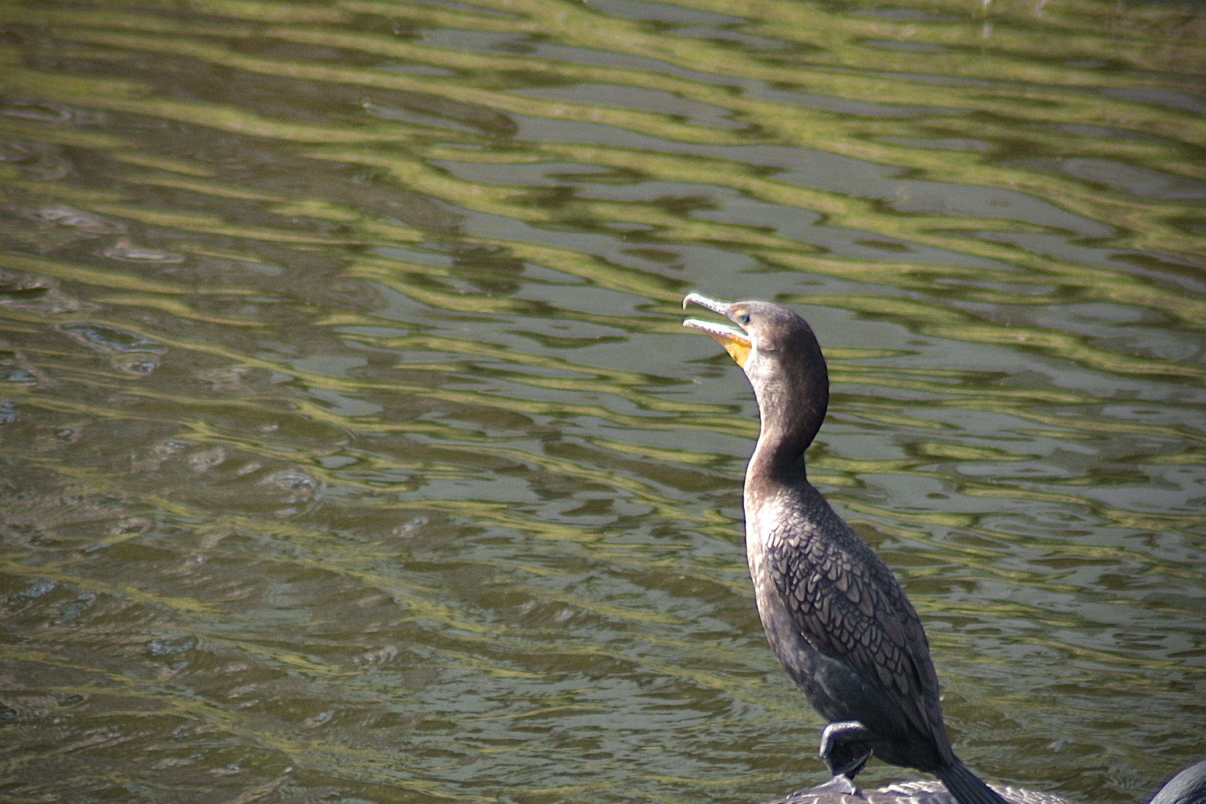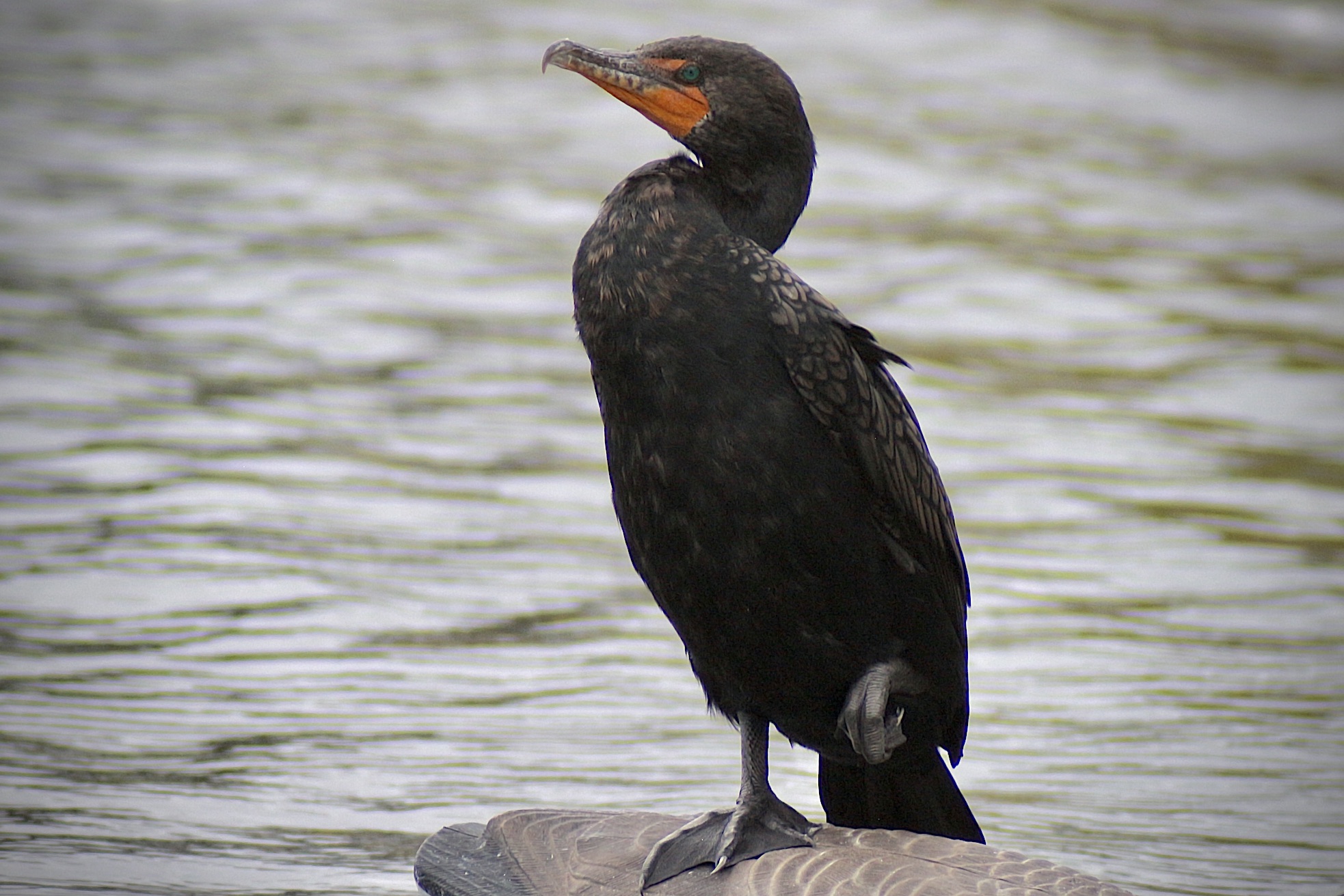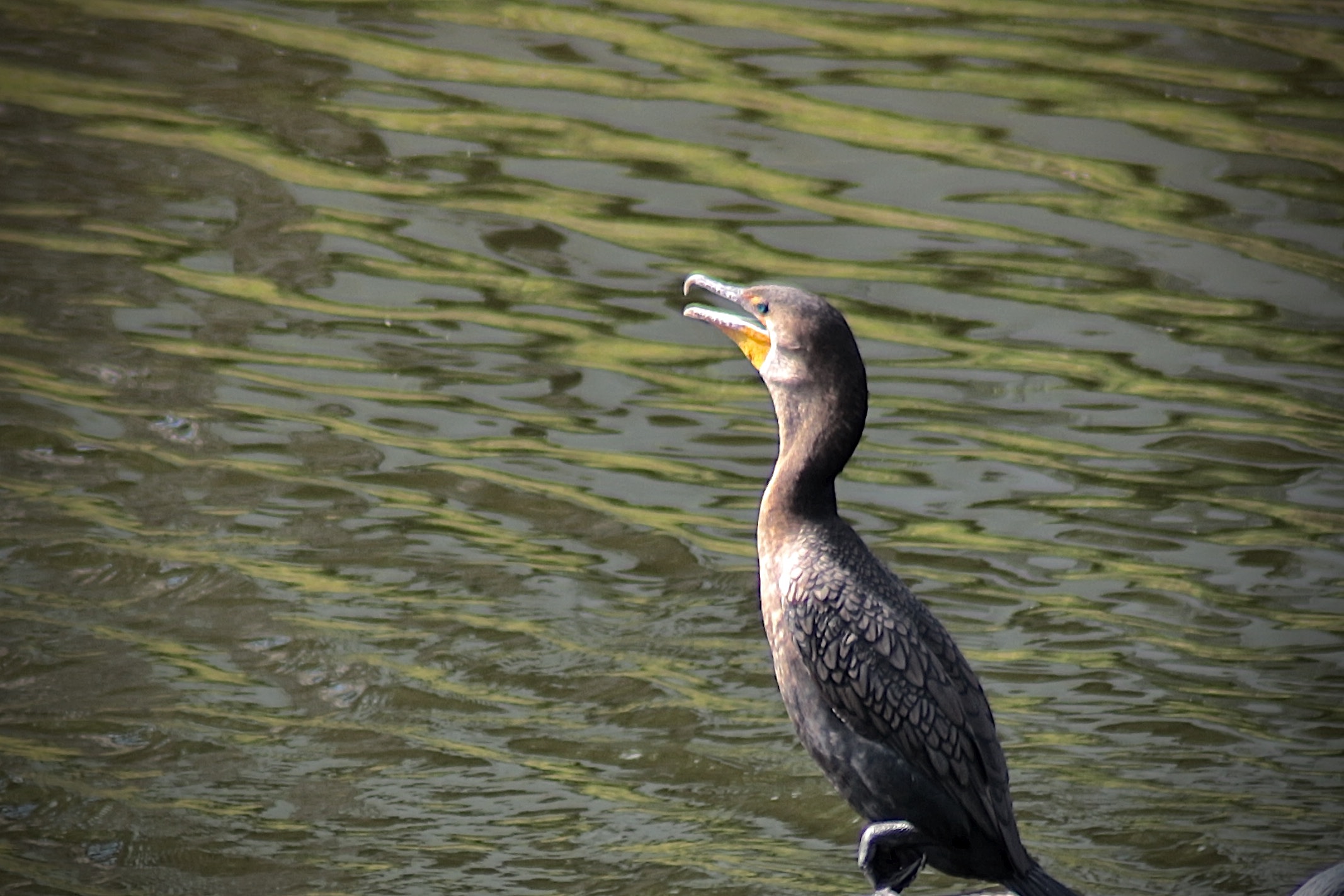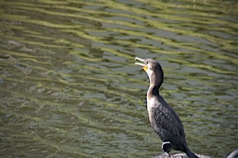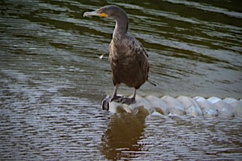 Dark body with orange bare skin at the base of the bill. Breeding adults are all black. Immatures and nonbreeders have paler breast. Dives underwater to catch fish. Swims like a duck in between dives. Finds open perches to spread wings and dry feathers.