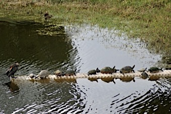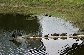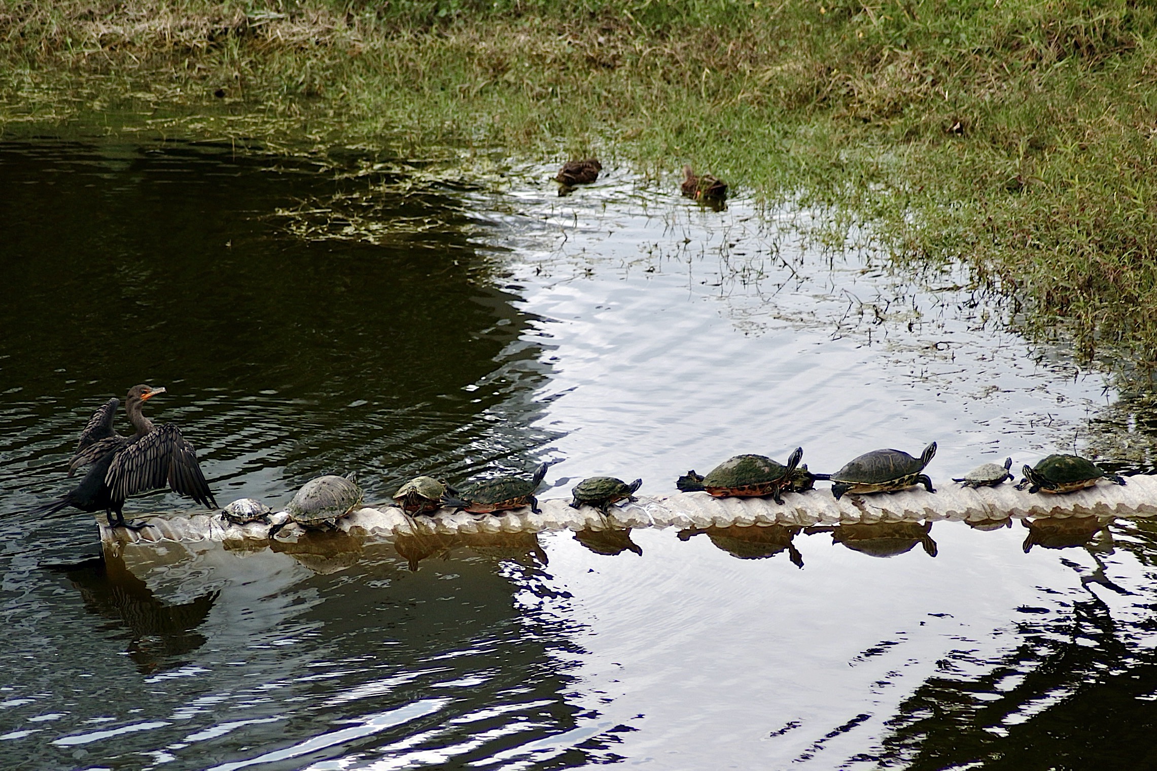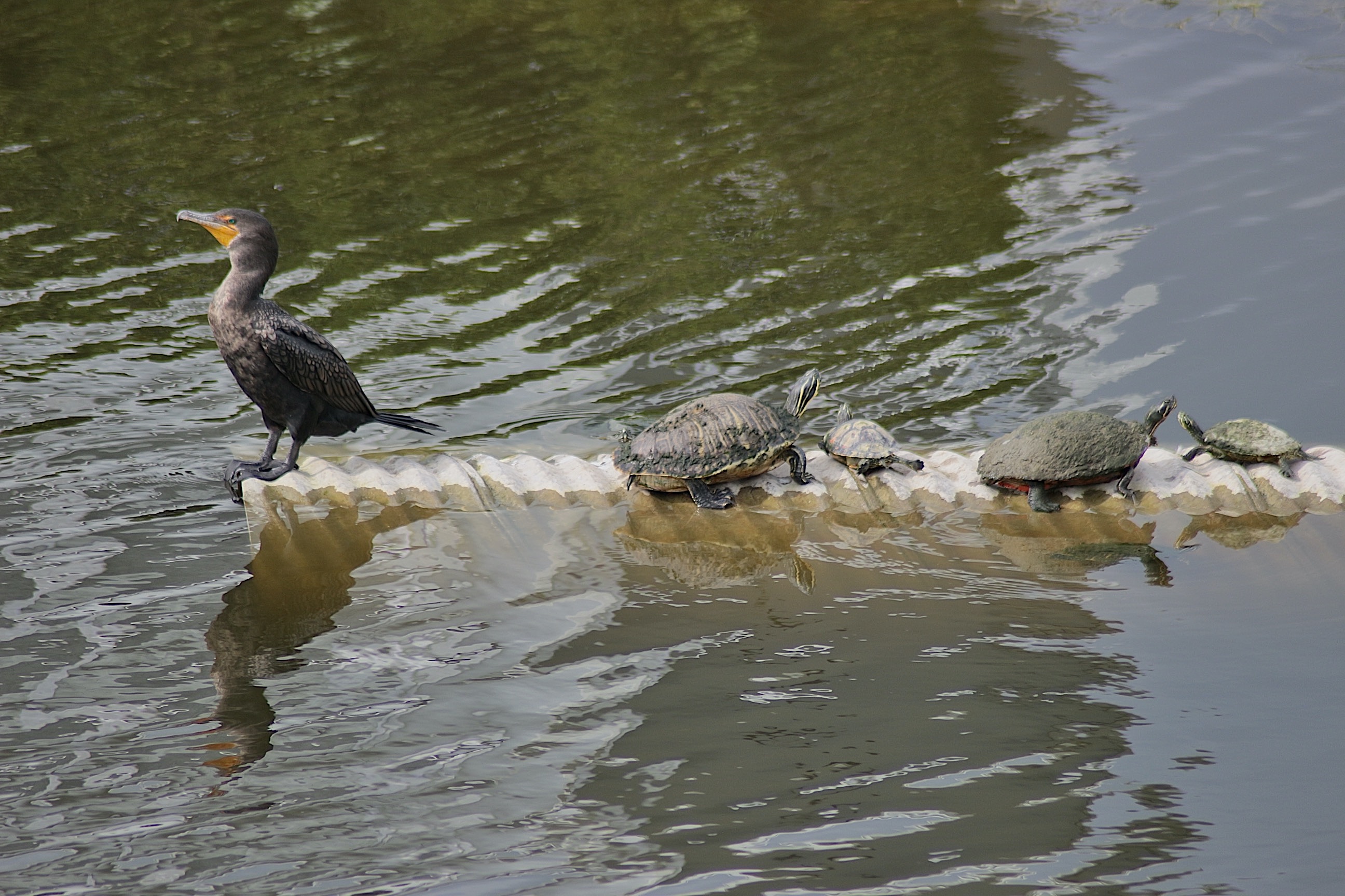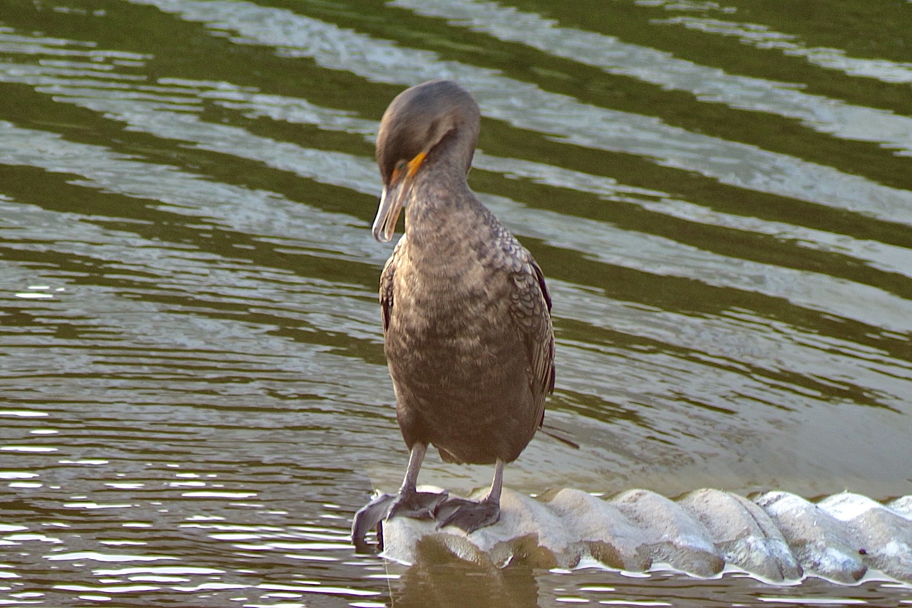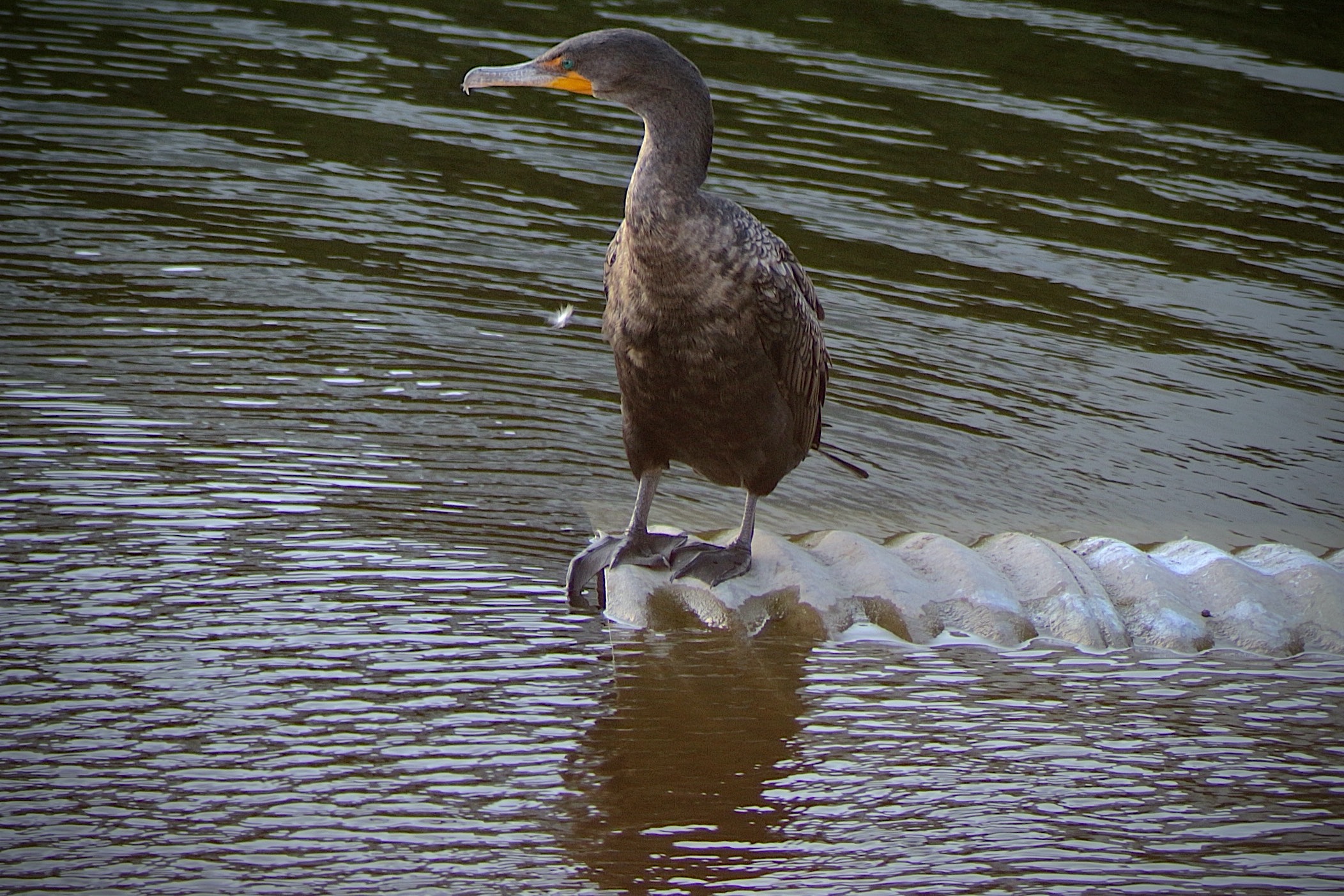Dark body with orange bare skin at the base of the bill. Breeding adults are all black. Immatures and nonbreeders have paler breast. Dives underwater to catch fish. Swims like a duck in between dives. Finds open perches to spread wings and dry feathers.