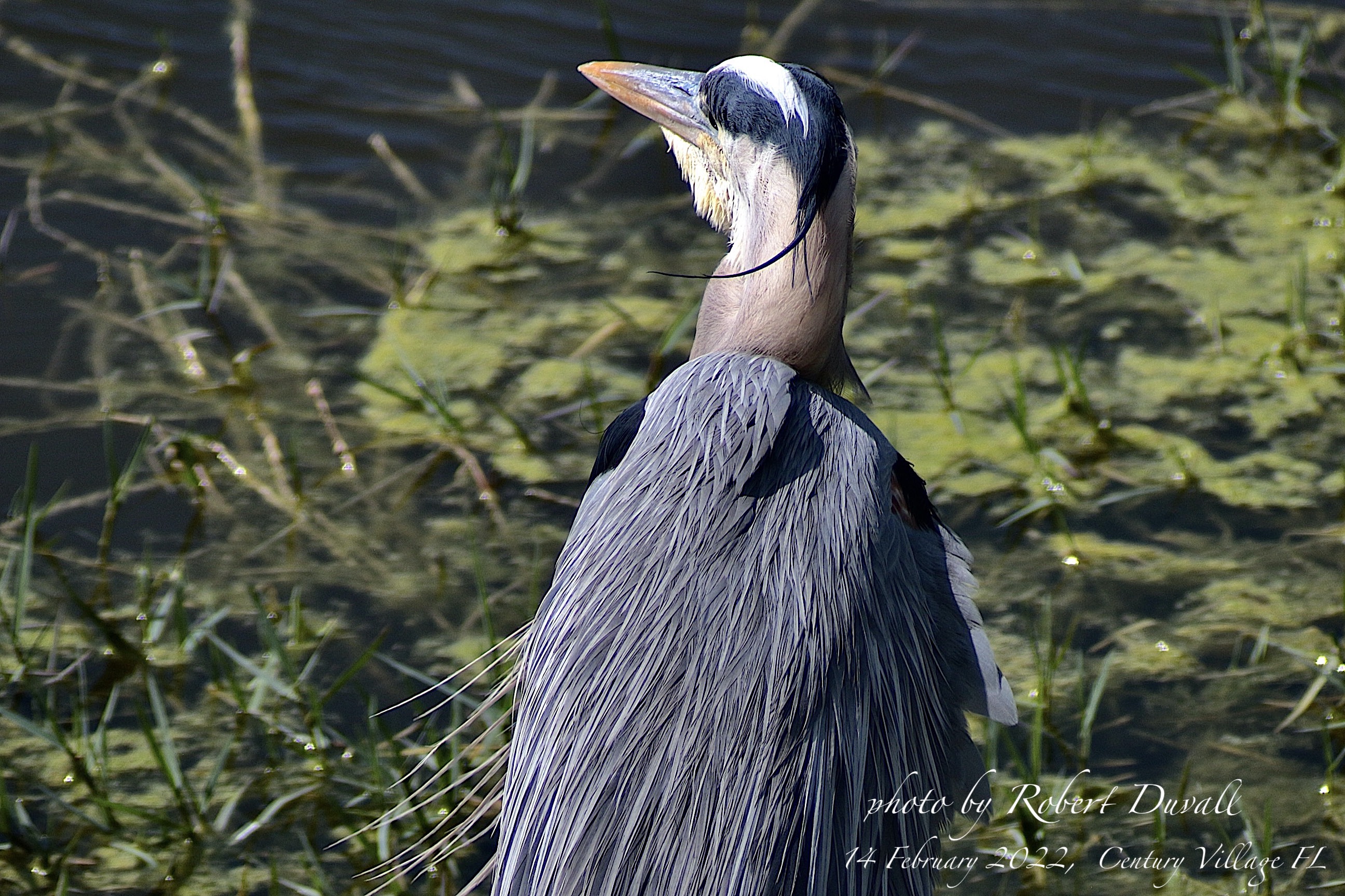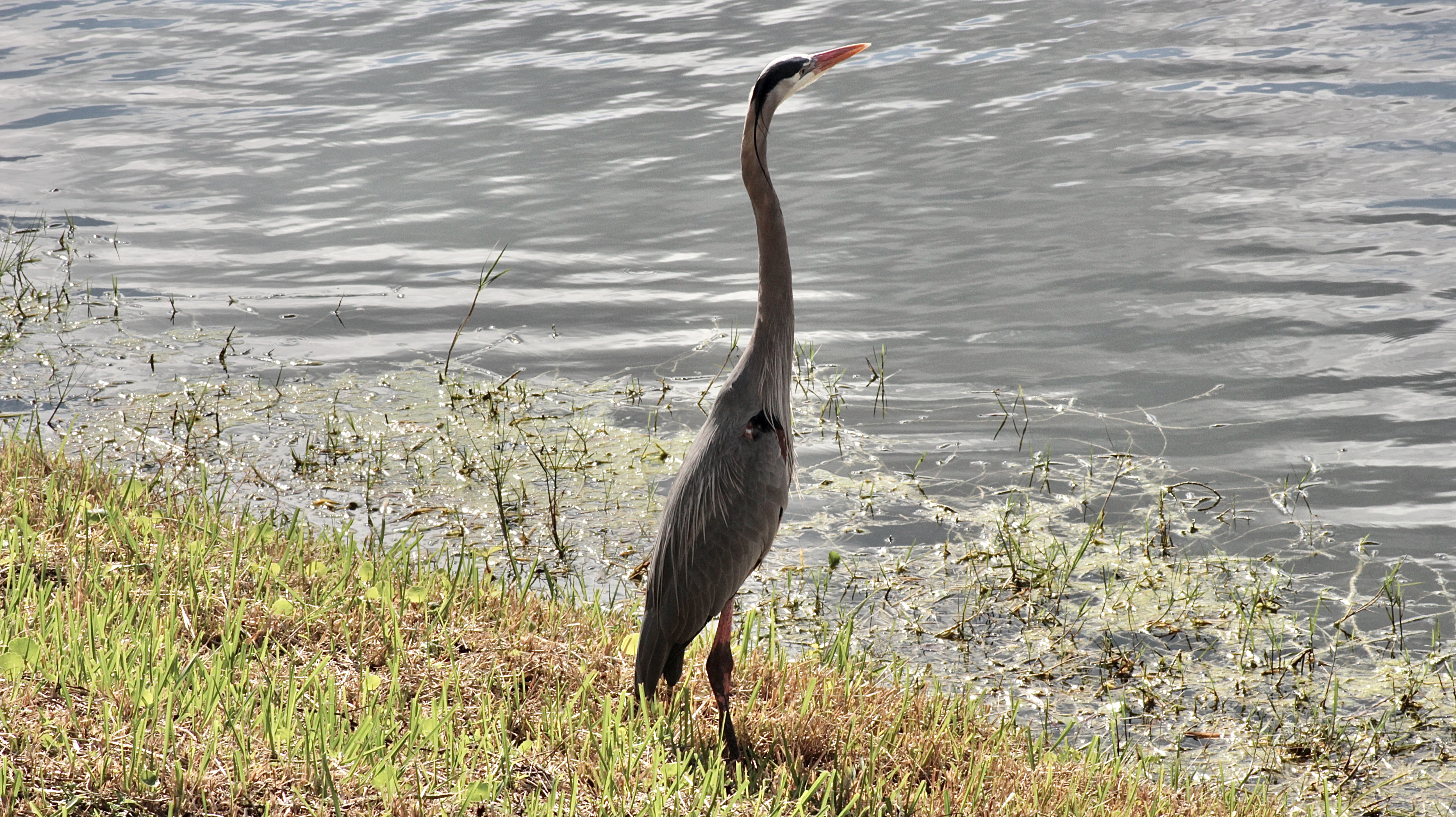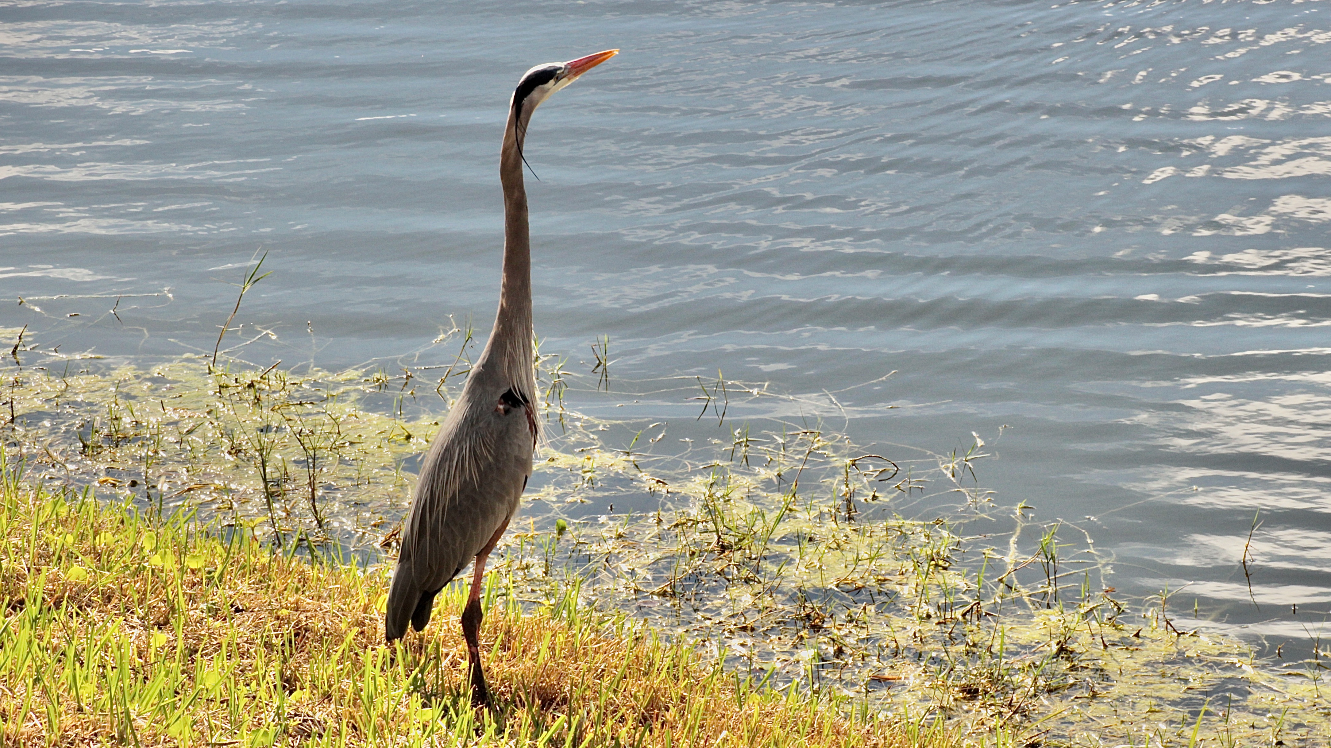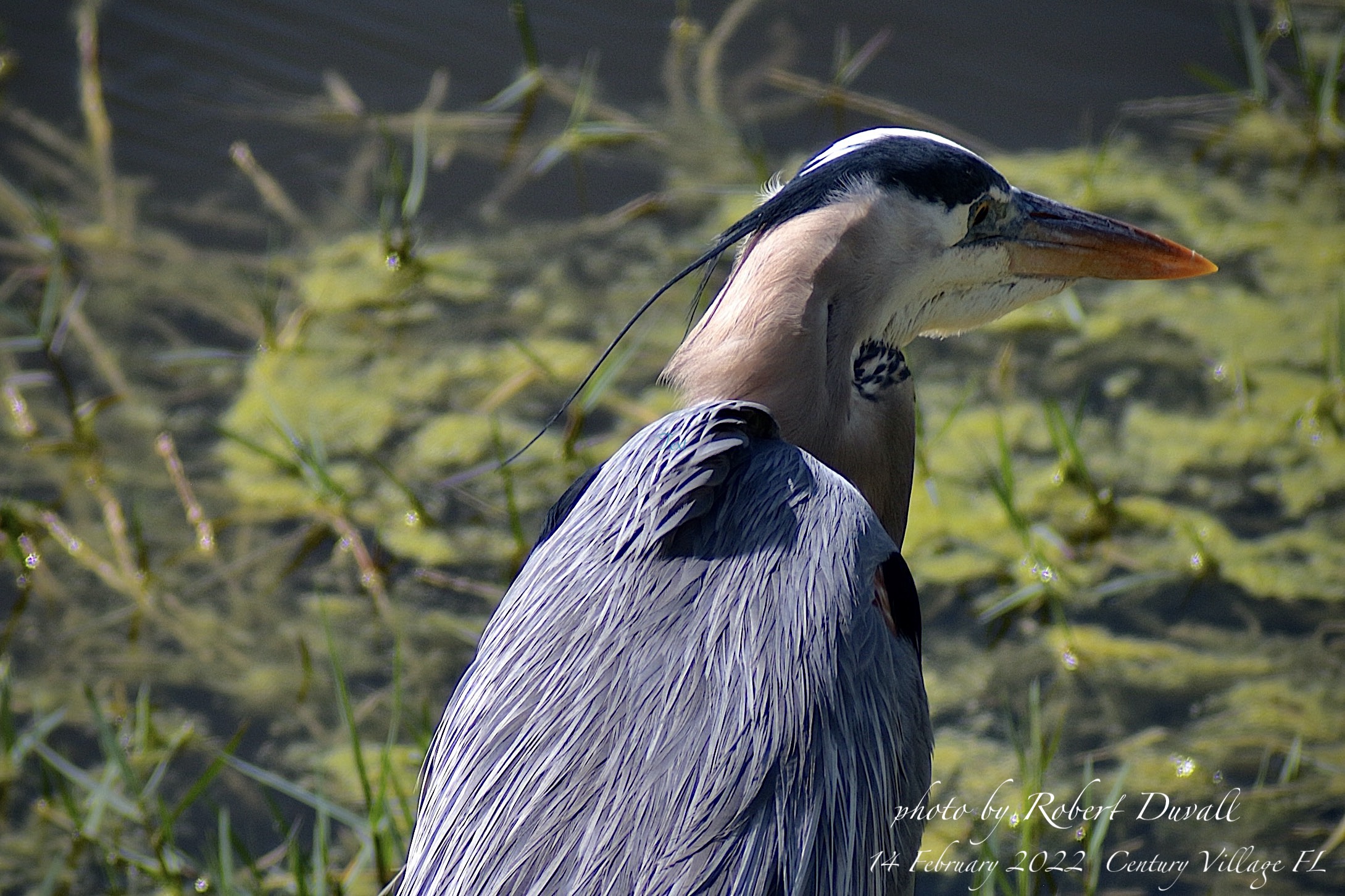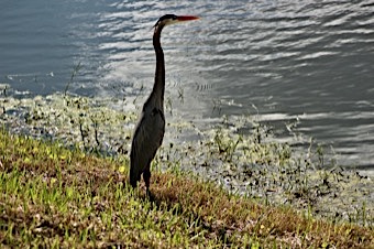 Very large and tall, with a long neck. Grayish-blue overall with long orangish-yellow bill and black crown and head plumes.