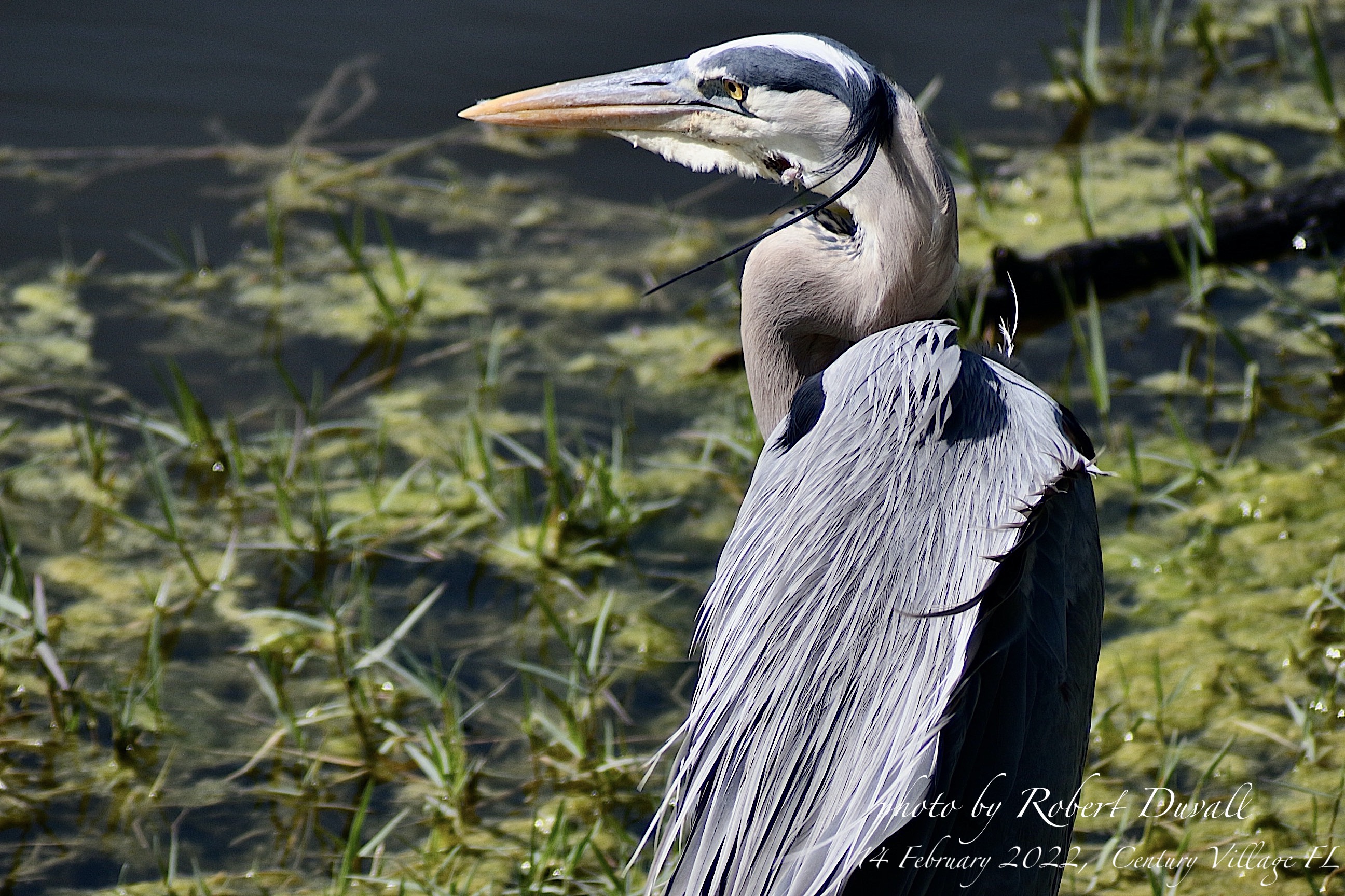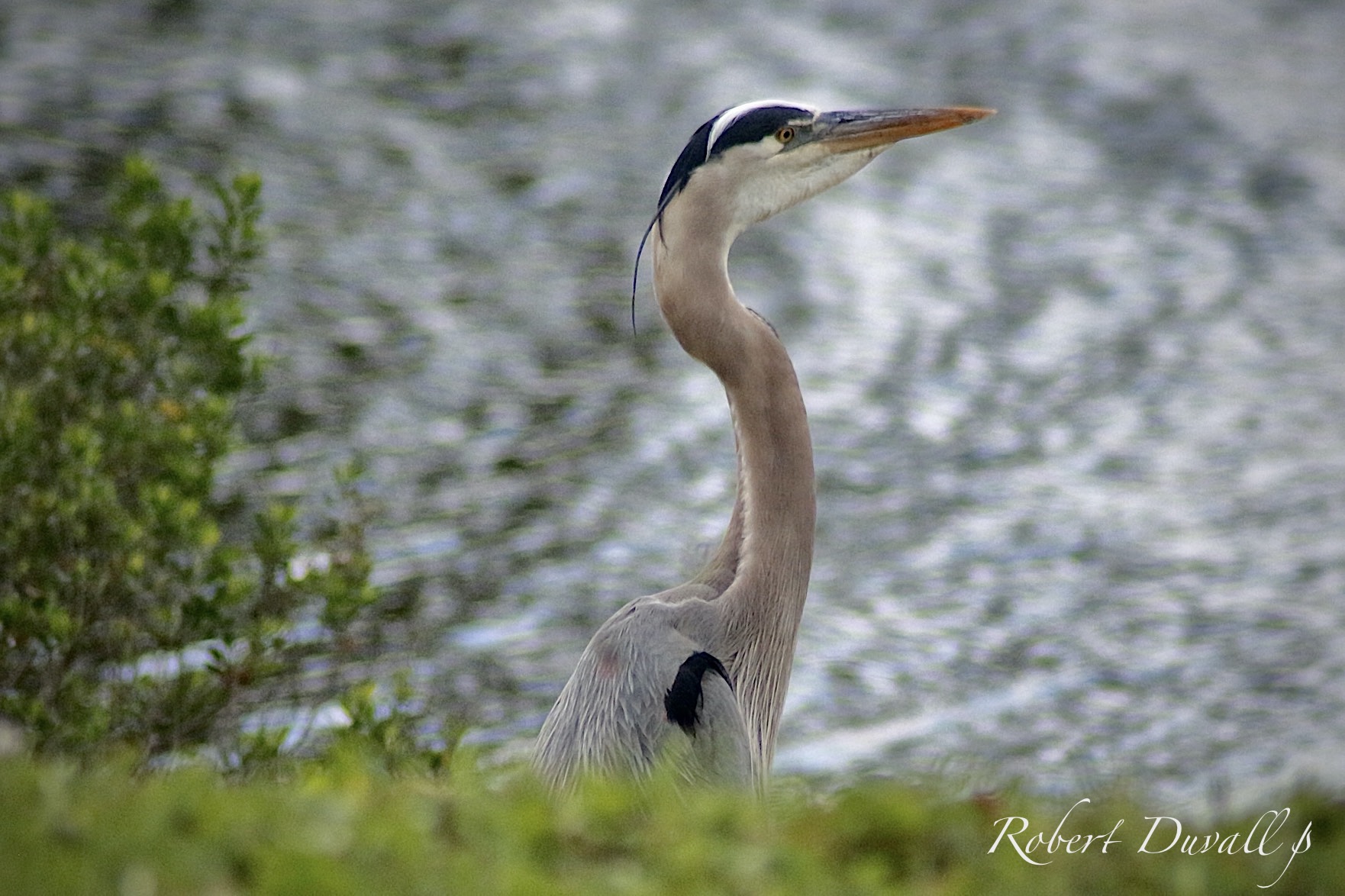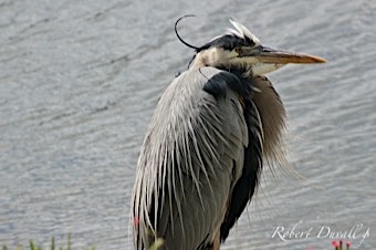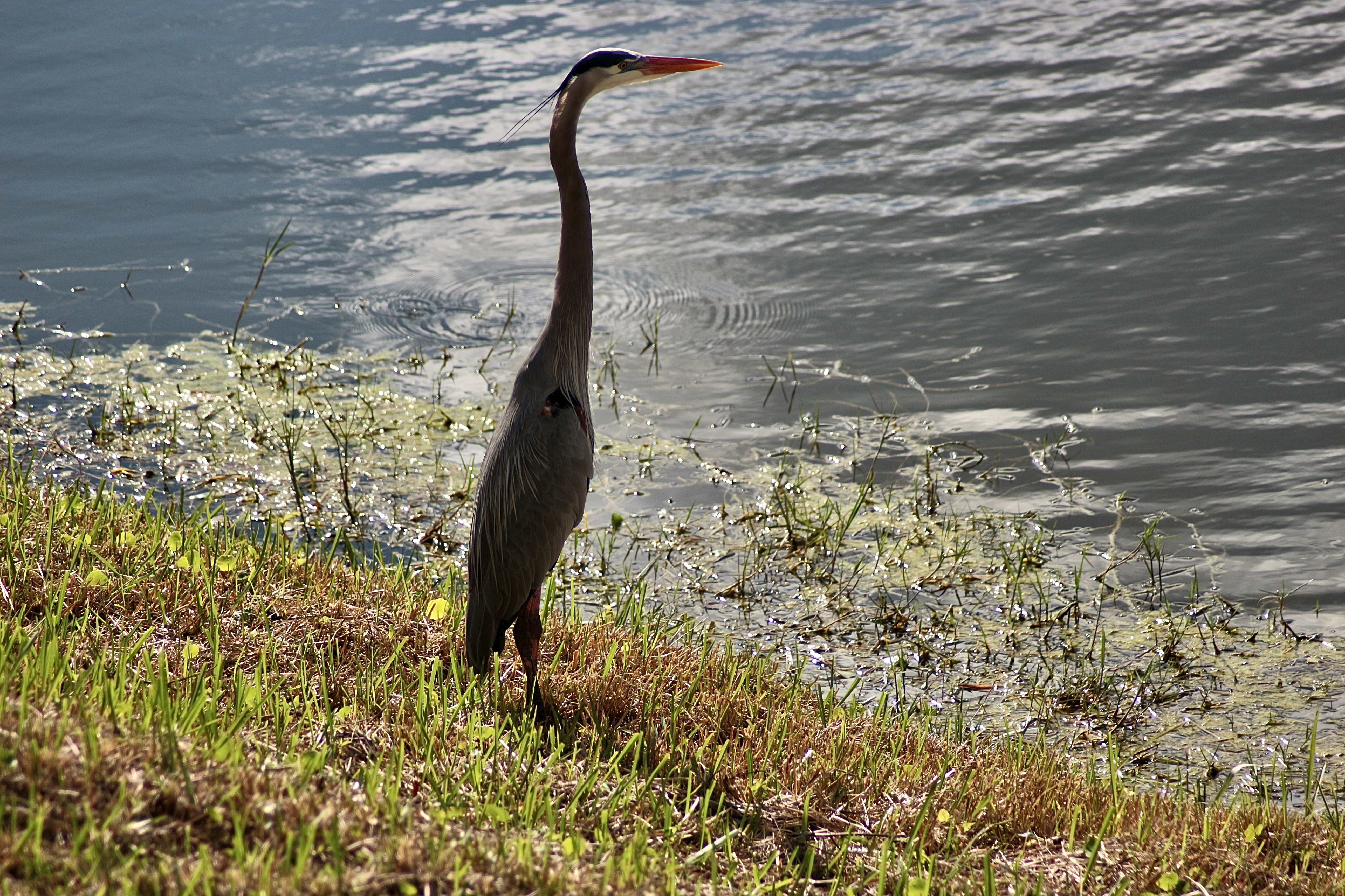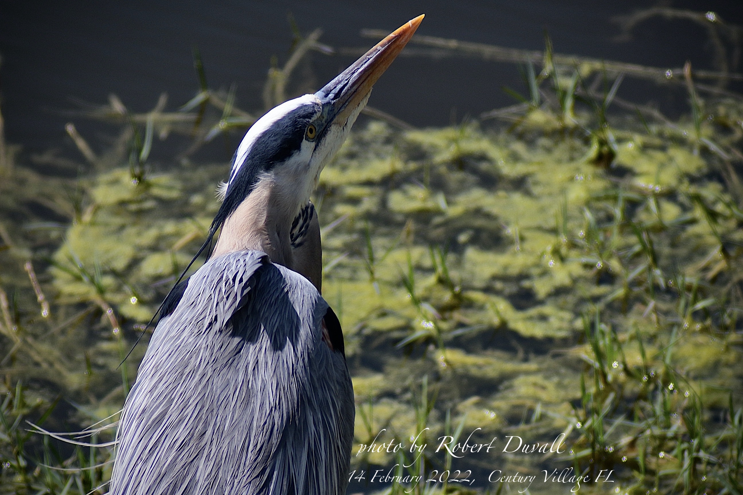 Very large and tall, with a long neck. Grayish-blue overall with long orangish-yellow bill and black crown and head plumes.