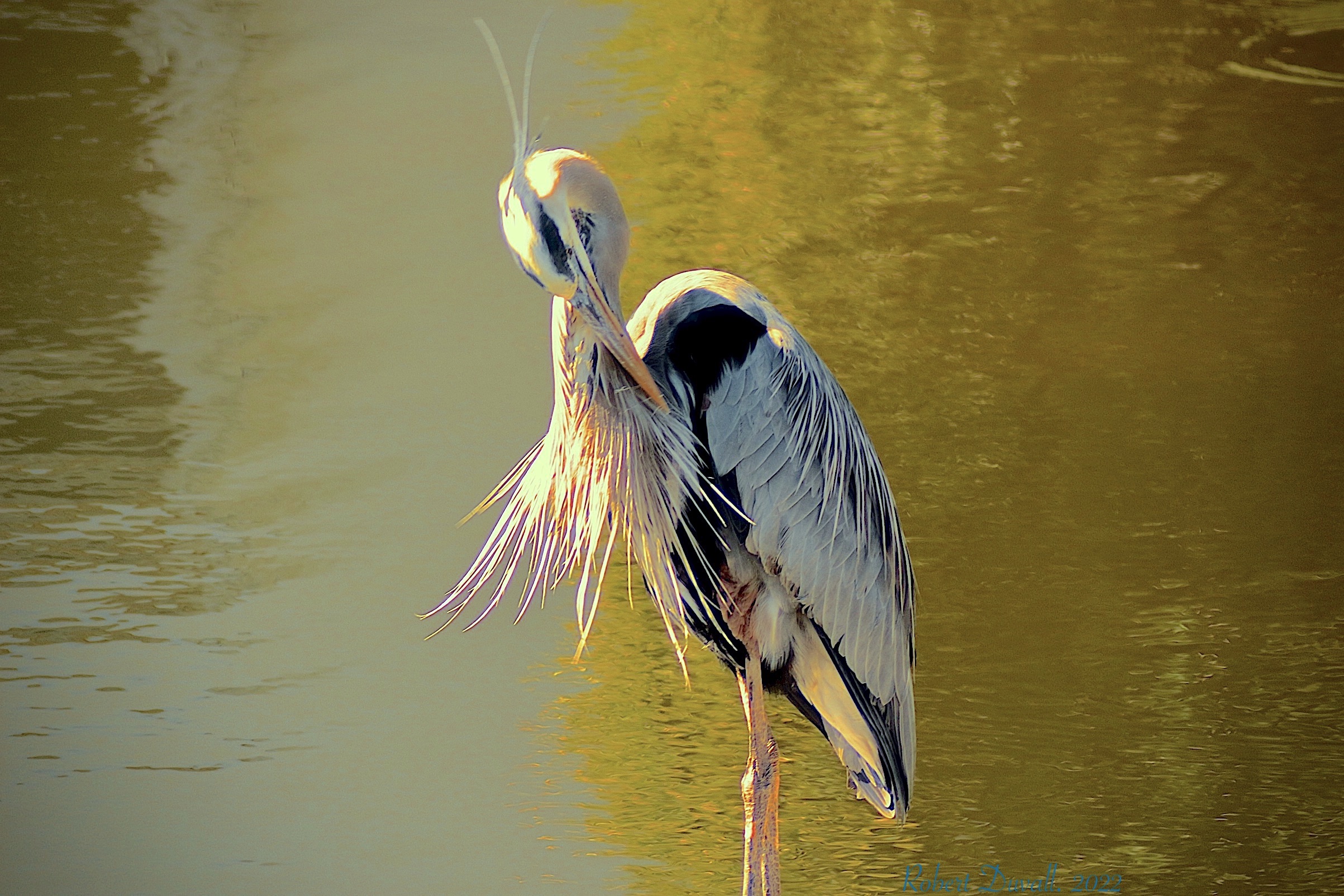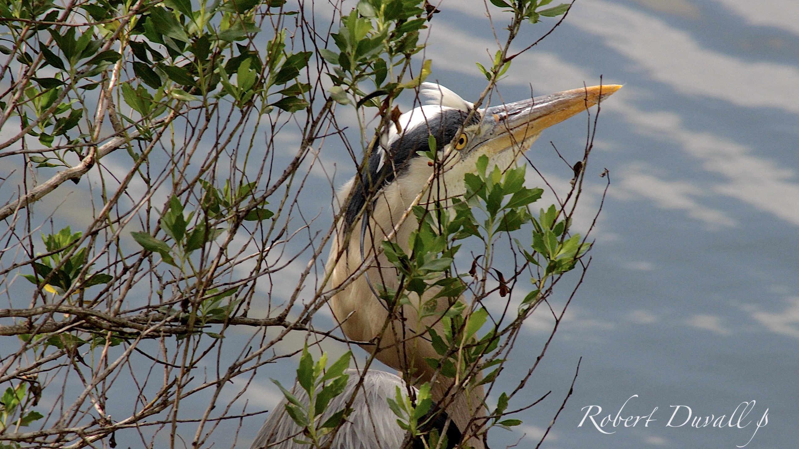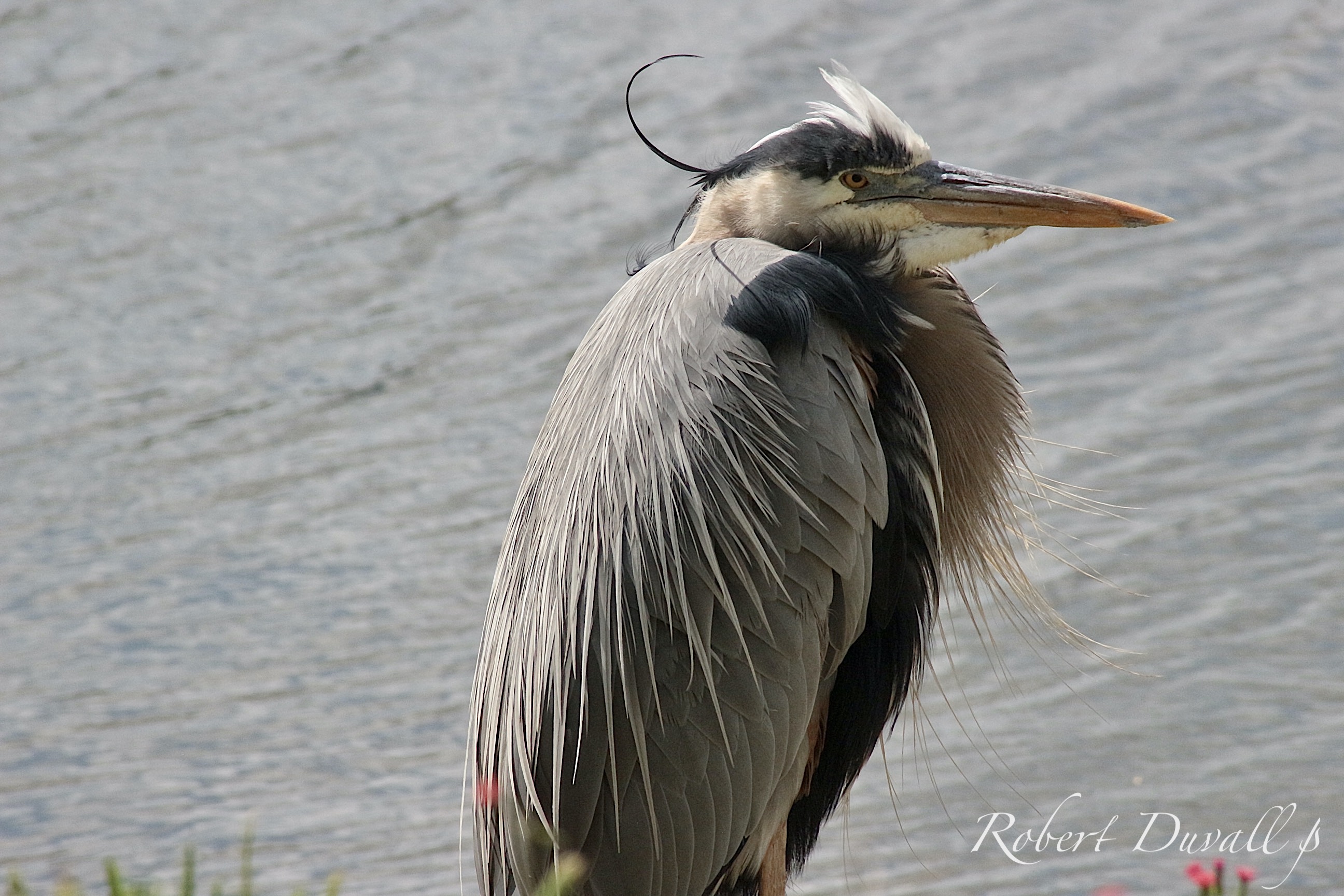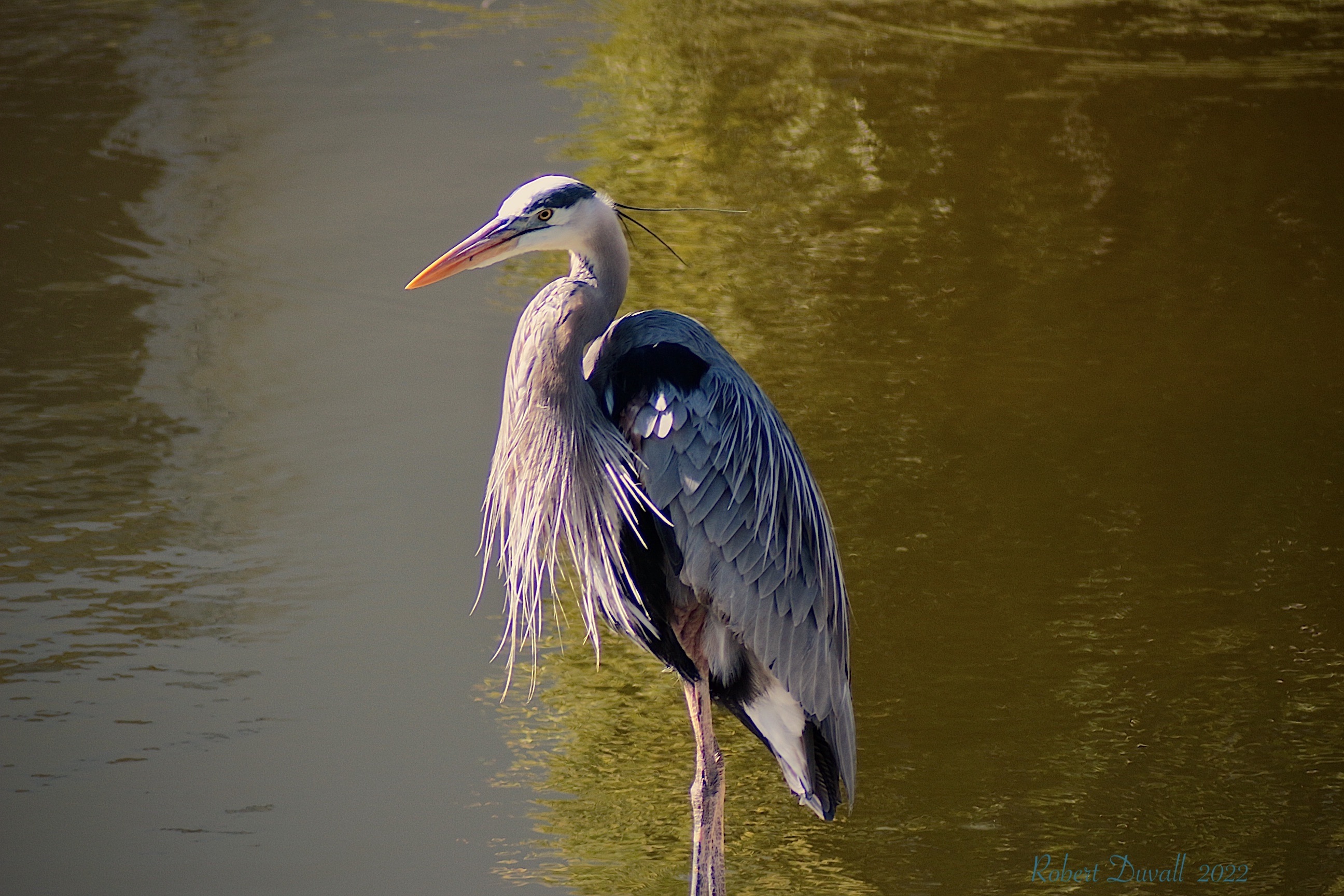 Very large and tall, with a long neck. Grayish-blue overall with long orangish-yellow bill and black crown and head plumes.